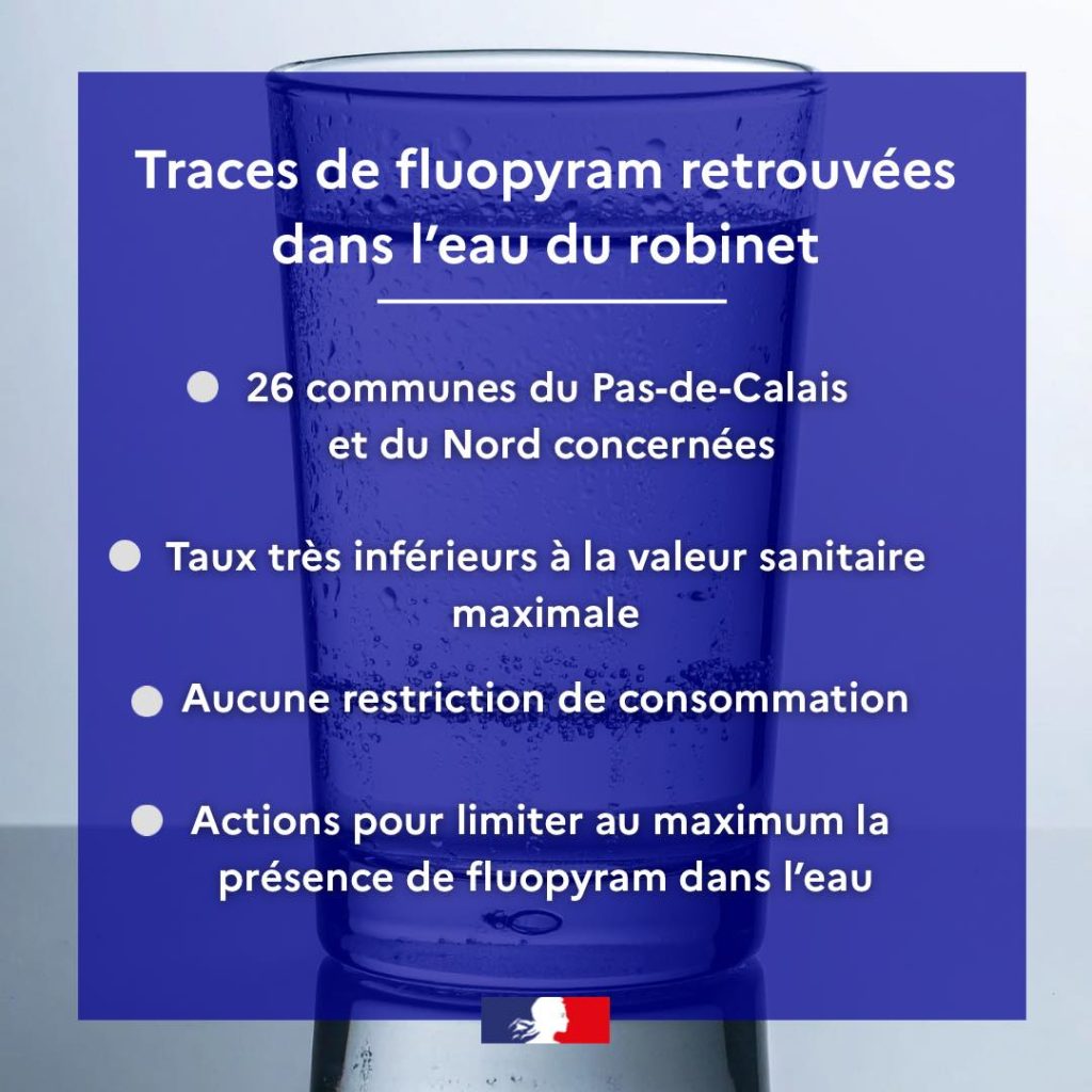 Suite à la détection de traces de fluopyram, une substance phytosanitaire autorisée au niveau européen, dans l’eau du robinet de 26 communes du Nord et du Pas-de-Calais, des analyses ont été réalisées dans le cadre du contrôle sanitaire de l’eau par l’Agence Régionale de Santé – ARS Hauts-de-France.