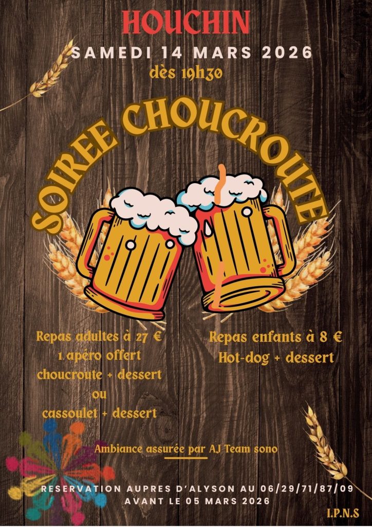 Nous vous annonçons une soirée Choucroute (ou cassoulet) le samedi 14 Mars 2026 à la salle polyvalente dès 19h30.